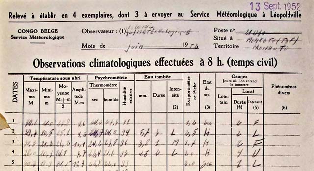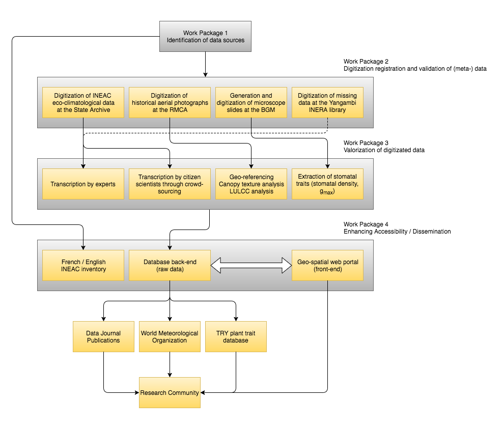 There is an urgent need for more long-term eco-climatological (baseline) measurements. Currently, large amounts of ecological and climatological data, approximately five decades (~1910 – 1960), exists as unexplored heritage, stored in various federal archives and collections. Within this context the archives of the Institut National d’Etudes Agronomique du Congo Belge (INEAC) at the State Archives (SA, INEAC March 2013, nr 1546, National Archives), the Royal Museum for Central Africa (RMCA) and the herbarium collections of the Botanic Garden Meise (BGM), with its large collection of tropical African plant specimens and complementary legacy data, are key. The inventory of these archives includes historic forestry, climatological, ecological, biodiversity data and aerial photographs, with great potential and relevance for current and future basic and applied forestry research in the central Congo Basin, particularly within the context of climate change. As of yet, a comprehensive dataset of long-term eco-climatological legacy data for the central Congo Basin is lacking.