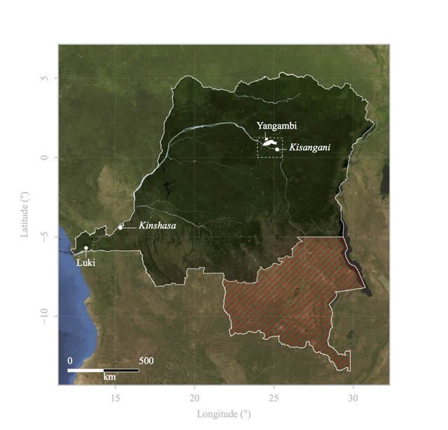 Assessments of canopy structure through historical aerial photographs will be limited to those areas currently located in and around present day permanent sampling plots, at Yangmbi and south of Kisangani, and data availability (covering a fraction of central the Congo Basin, see Fig. 2. dashed white rectangle). Furthermore, limited to no additional data field measurements on forest structure is available from other locations, reducing the potential of in depth analysis outside of the areas surrounding present permanent sampling plots. Scaling also requires expensive high resolution satellite imagery (~$500 / 100 km2 scene), discouraging such large scale research efforts.